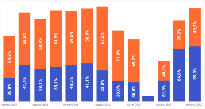 Внутрішні перепродажі при цьому склали 50,6% від загальної кількості операцій (285,5 тис. шт.), а імпорт авто з пробігом — 49,4% (278,6 тис. шт.). Для порівняння, у 2021 році з січня до червня привезли з-за кордону 204,6 тисячі вживаних легковиків, що становило 32,4% від загальної кількості продажів.