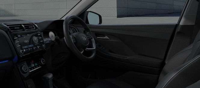 Салон теж має переважно чорний колір, який на сидіннях розбавлений контрастним простроченням. Creta отримала спортивне кермо та більш комфортні передні крісла.