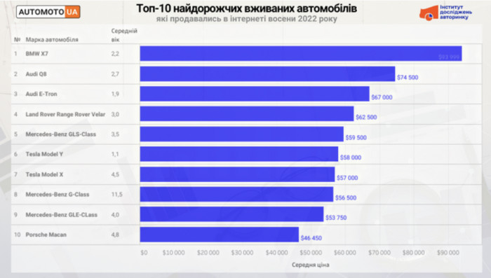 Найдорожчою моделлю серед вживаних автомобілів на ринку виявися BMW X7. Його середня ціна склала $93 999, за авто середнім віком 2,2 року. На другому місці опинився Audi Q8 (середня ціна $74 500, середній вік 2,7 року), а на третьому – Audi E-Tron ($67 000, 1,9 року).