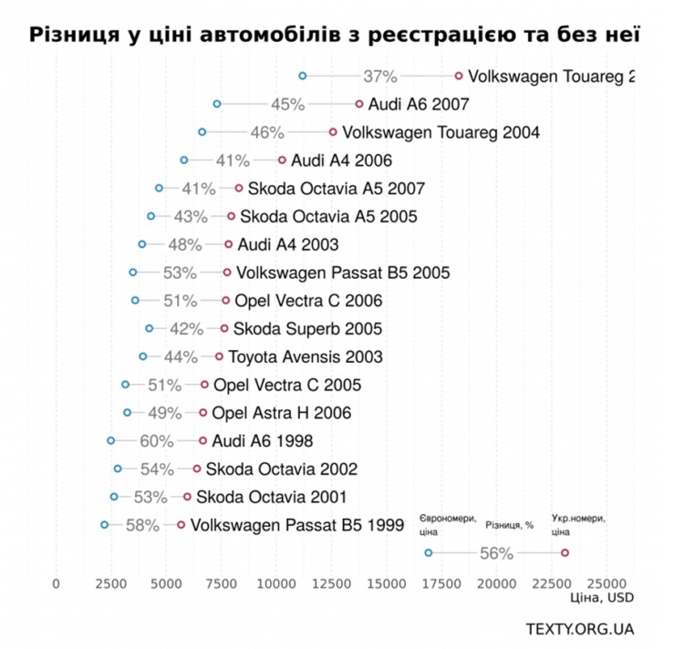 Ціни на машини з реєстрацією та без неї