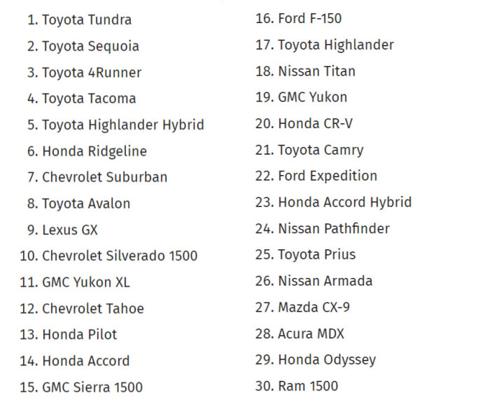 Найвищу ймовірність проїхати 400 000 кілометрів має Toyota Tundra (36,6%). Таким чином, цей пікап у 4,2 раза більш живучий, ніж середньостатистичне авто. У ТОП-5 найбільш безвідмовних машин увійшли всі автомобілі марки Toyota – Sequoia (36,4%), 4Runner (26,8%), Tacoma (26,8%) і Highlander Hybrid (25,9%). У рейтингу ТОП-30 найдовговічніших авто від iSeeCars домінування японського бренду також не можна не помітити.