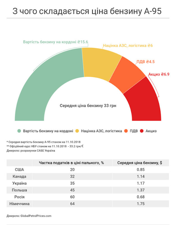 Таким чином ціна бензину А-95, яку ми бачимо на українських АЗС, є прямою похідною від вартості нафти і бензину на міжнародних ринках і курсу гривні до долара США та євро.