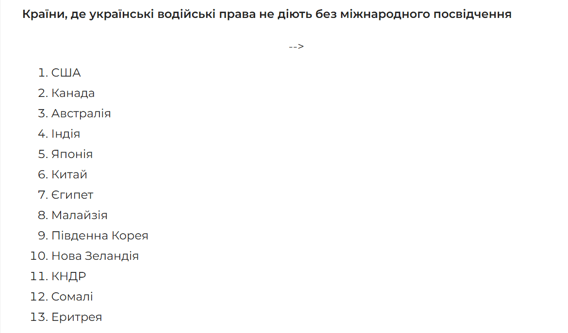 Щоб мати можливість керувати транспортом у зазначених країнах, слід оформити міжнародний дублікат або місцеві права. Український документ тут перетворюється на шматок пластику. Виною всьому відмова від ратифікації зазначеними країнами Віденської конвенції про дорожній рух 1968 року. Цей документ підтверджує взаємне визнання національних посвідчень.