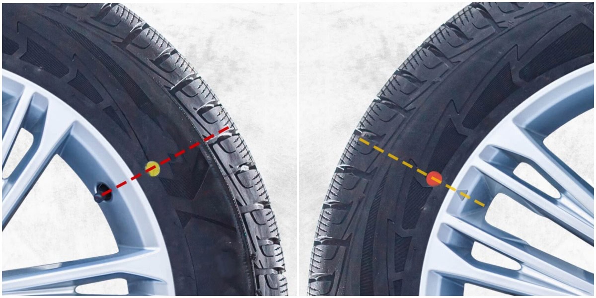 Червона крапка позначає місце на шині, де вона має найбільшу жорсткість. Це частина, яка менше гнеться в порівнянні з іншими зонами. А ось жовта крапка вказує на найм’якшу частину шини — місце, яке має найменший опір до деформацій.