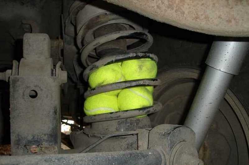 Інколи можна побачити яскраві жовто-зелені тенісні м’ячі, що натрамбовані між витками пружин. Одразу ж виникає запитання: навіщо? Це явно не декор. Тим паче, що виглядає таке явище так собі. насправді таким чином водії намагаються підсилити підвіску, коли та вже ледве тримається. Як пояснив виданню «Твоя МАШИНА» автомеханік Станіслав, який 15 років ремонтує підвіски у харківському СТО, цей трюк часто використовують автомобілісти, котрі возять важкі вантажі в легковиках.
