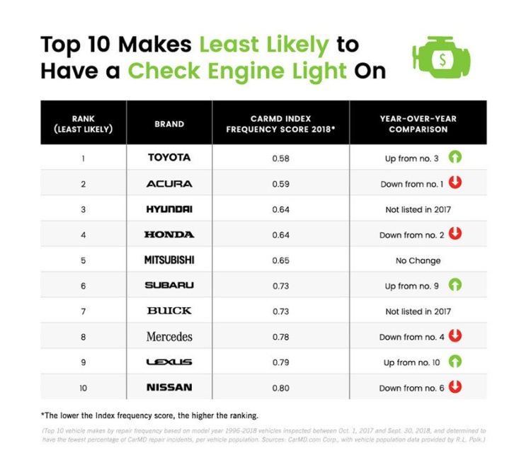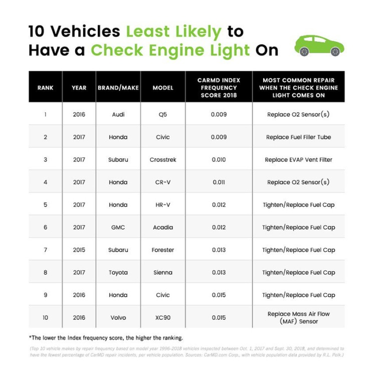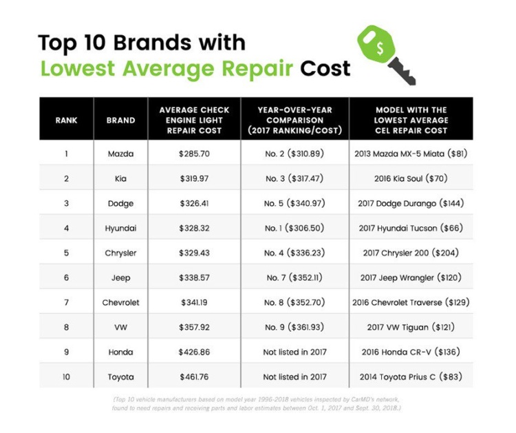 У CarMD проаналізували понад 5,6 мільйона машин, випущених з 1996 по 2018 роки. В якості основного прикладу для оцінки вартості ремонту вибрали усунення неполадок, про які сигналізує значок Check Engine.