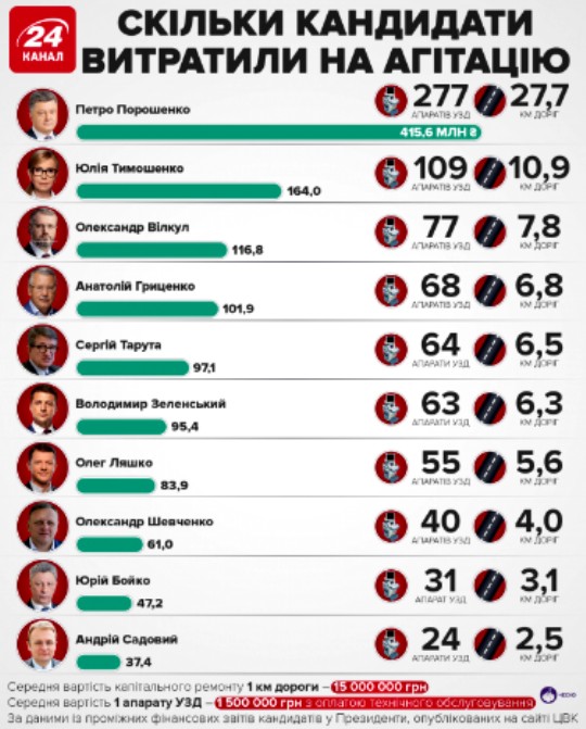 Середня вартість капітального ремонту 1 км дороги, яка, за словами міністра інфраструктури України Володимира Омеляна становить 15 млн грн. Середня вартість одного апарату УЗД, згідно із даними держзакупівель, становить 1,5 млн грн. Виходить, що витрати кожного кандидата на вибори цілком можна порахувати у практичних вчинках. Результати виглядатимуть отак: