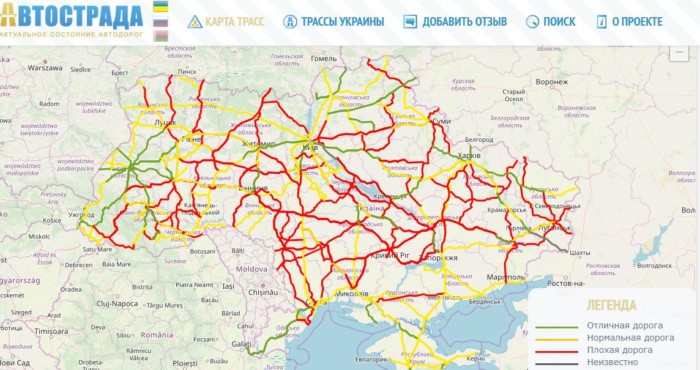Якщо відкрити сайт Автострада, який показує актуальний стан українських доріг, то можна побачити, що більшість напрямків позначені червоним кольором, що свідчить про погані дороги. З цим висновком можна погодитися – на схід і південь від Києва живих доріг, які можна було б позначити зеленим кольором, справді залишилося дуже мало.