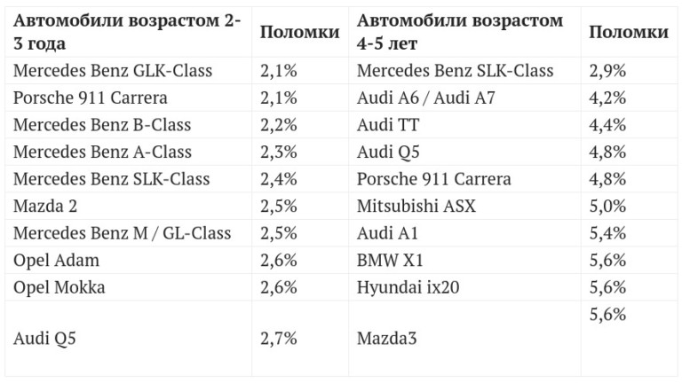 За даними асоціації, серед «свіжих» машин віку 2-3 роки найнадійнішими автомобілями є переважно німецькі моделі автомобілів. Зокрема, Mercedes-Benz, Porsche, Audi і Opel, хоча і одна модель Mazda увійшла в ТОП-10 найнадійніших автомобілів з пробігом. У категорії 4-5-річних автомобілів також переважають моделі німецьких брендів, але є дві японських і одна корейська машина.
