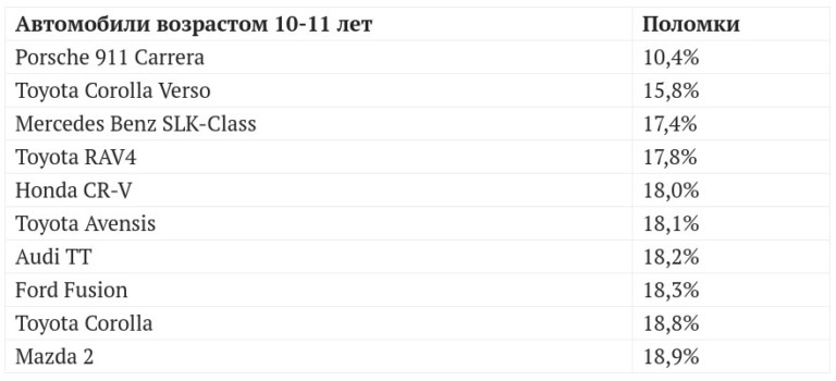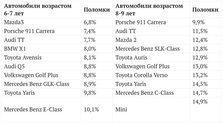 ТОП-10 надійності уживаних автомобілів у віці 6-7 років, як стверджують в TUV, очолює Mazda3, а також дві моделі Toyota, інші – автомобілі німецького виробництва. Автомобілі віком 8-9 років також складаються переважно з німецьких машин, але японських моделей вже більше (4 од.), ніж в категоріях від 2 до 7 лет.