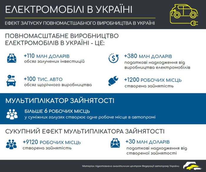 Для України запуск повномасштабного виробництва електромобілів може мати величезний ефект – близько 110 млн доларів залучених інвестицій, 1200 додатково створених робочих місць, випуск 50-100 тис. електромобілів на рік.