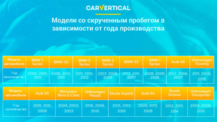Найбільш «скручують» BMW – це моделі у віці від 10 до 15 років, а Mercedes-Benz E-Class – моделі 2002-2004 років. Volkswagen Passat, Skoda Superb і Skoda Octavia «скручують» протягом перших 10 років використання.