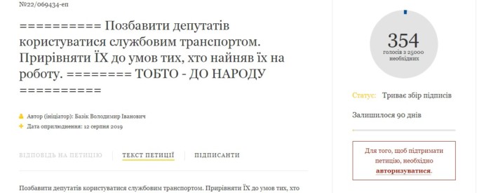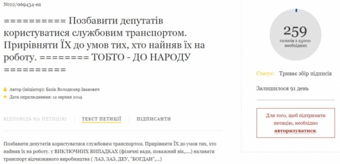 «Позбавити депутатів користуватися службовим транспортом. Прирівняти ЇХ до умов тих, хто найняв їх на роботу. у ВИКЛЮЧНИХ ВИПАДКАХ (фізичні вади, поважний вік,….) налавати транспорт відчизняного виробництва ( ЛАЗ, ЗАЗ, ДЕУ, “БОГДАН”,…)», – йдеться у тексті петиції №22/069434-еп.