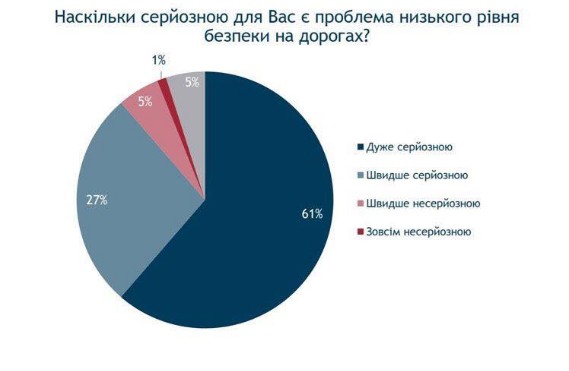 Так, за результатами дослідження, 61% українців вважає, що проблема безпеки на дорогах є дуже серйозною. 59% українців повністю підтримують, а 27% скоріше підтримують підвищення штрафів за порушення, що призводять до травм та смертей.