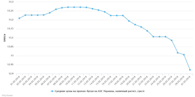 Зріджений нафтовий газ СПБТ, використовуваний в якості моторного палива, за 01 березня 2018 подешевшав на 0.65% (8,0 коп/л) до 12.92 грн/л.