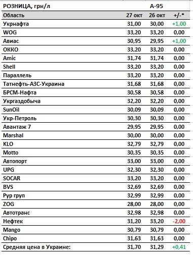 27 жовтня роздрібні ціни на обидва види палива зросли на 41 копійку за день. Таким чином, середня роздрібна ціна бензину А-92 складає 30,80 грн/л, А-95 – 31,70 грн/л, дизеля – 30,60 грн/л. А ось автогаз залишився коштувати 18,45 грн/л.