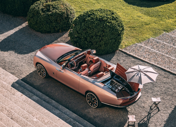 Новий Rolls-Royce Boat Tail відрізняється особливим перламутровим забарвленням з капотом коньячного кольору та кавовим тканинним дахом. Салон та кришка багажника оздоблені горіховим деревом та імітують палубу корабля. Взагалі, назва моделі перекладається як “корма човна” і її позиціонують, як свого роду сухопутну яхту.