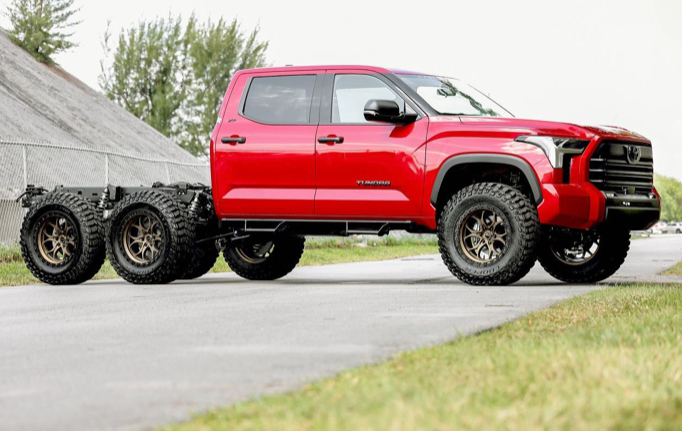 Американці подовжили автомобіль приблизно до 7 м та додали ще одну пару коліс. Крім того, пікапу збільшили кліренс, а також встановили 24-дюймові ковані диски Vossen HF6-5 зі спеціальною позашляховою гумою. Також привертають увагу сталеві підніжки. Салон Toyota Tundra не чіпали і він не змінився.