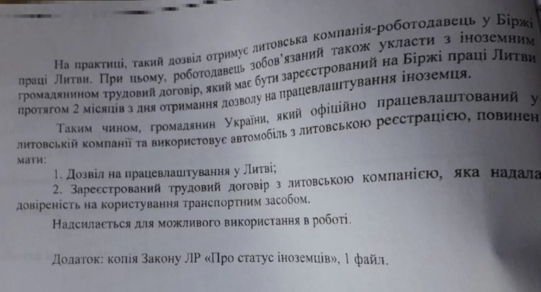 - Зареєстрований трудовий договір з литовською компанією, що видала доручення на керування транспортним засобом.