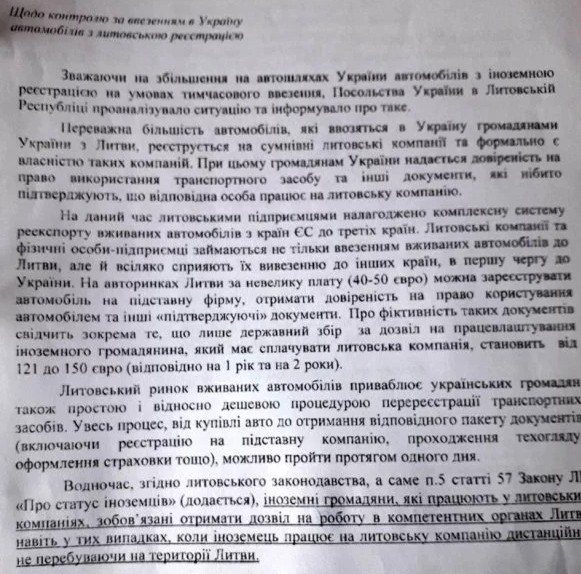 МЗС своїм листом роз’яснило для МВС та ДФС, як контролювати законність ввезення на митну територію України транспортних засобів з литовською реєстрацією.
