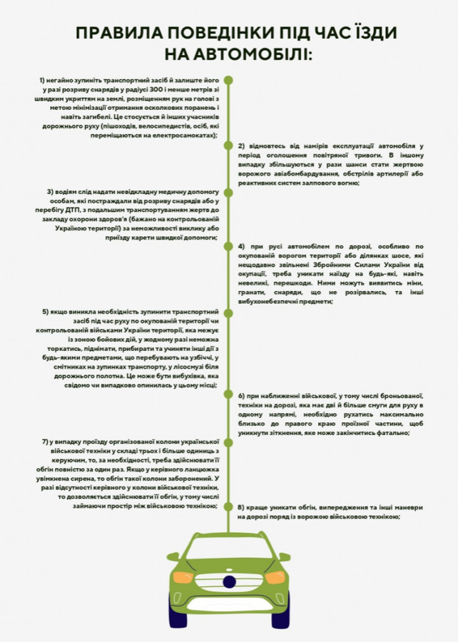 «Ураховуючи вразливість учасників дорожнього руху у період воєнного стану, вимушену необхідність мільйонів громадян України у переміщенні на автомобільному та іншому транспорті на значні відстані територією держави науковцями НДІ ВПЗ було розроблено Пам’ятку „Правила поведінки учасників дорожнього руху під час війни“», — пояснили в науковій установі.