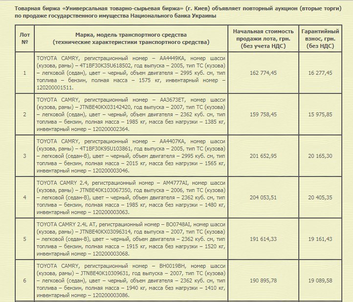 Національний банк України виставив на повторний аукціон 9 автомобілів Toyota Сamry, які перебувають на балансі банку. Про це інформує прес-служба НБУ.