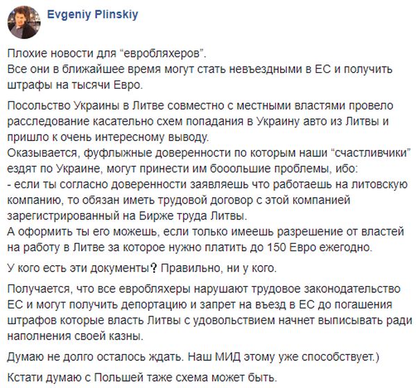 Власники «євроблях» ризикують найближчим часом стати нев’їзними в ЄС і отримати штрафи на чималі суми. Про це на своїй сторінці у Facebook повідомив журналіст Євгеній Плинський.
