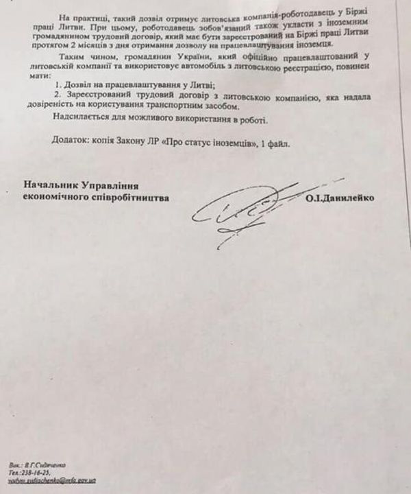 — «Виявляється, фуфлижні довіреності за якими наші «щасливчики» їздять по Україні, можуть принести їм великі проблеми. Якщо ти згідно з довіреністю заявляєш, що працюєш на литовську компанію, то зобов’язаний мати трудовий договір з цією компанією зареєстрований на біржі праці Литви. А оформити ти його можеш, якщо тільки маєш дозвіл від влади на роботу в Литві за який потрібно платити до 150 євро щорічно. У кого є ці документи? Правильно, ні у кого», — підкреслив Плинський.