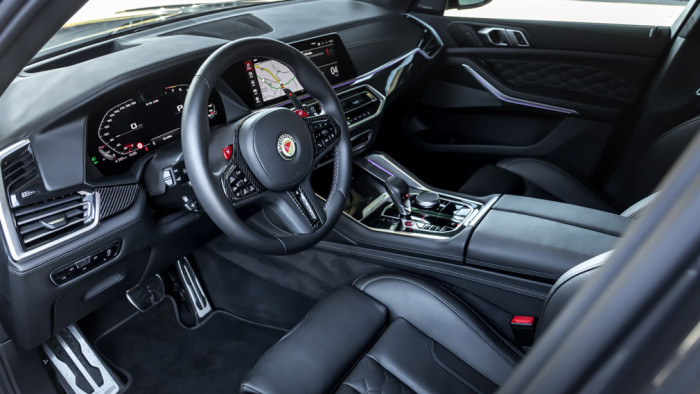 Доробки інтер’єру X5 M набагато скромніші — ательє Manhart додало нові підлогові килимки, пелюстки перемикання передач, а також карбонове оздоблення рульового колеса.