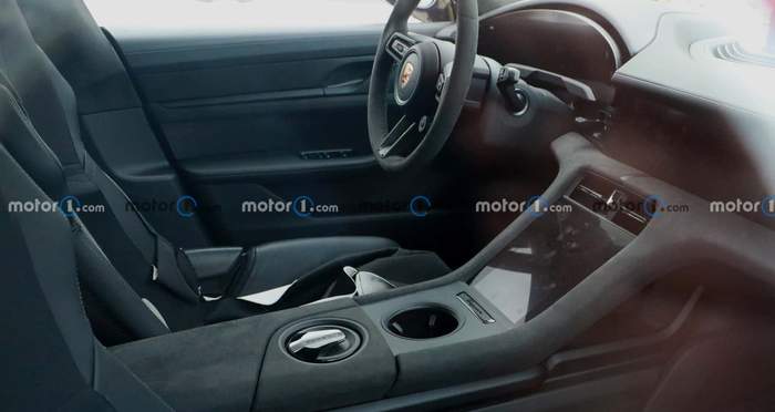На одному з шпигунських знімків можна зазирнути всередину кабіни, де приладова панель, здається, була трохи модифікована. Область над цифровою панеллю приладів виглядає більш насиченою, оскільки екран більше не так видно. Салон виконаний у чорному кольорі з використанням алькантари та шкіри, а під центральним підлокітником помічена пляшка або фляга з логотипом Porsche.