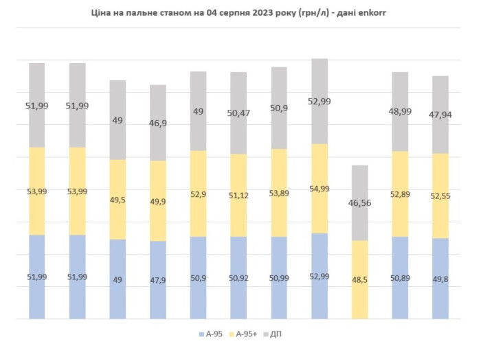 Загальнонаціонально, середня ціна на бензин А-95 зросла на 1,42 грн/л і становить 49,98 грн/л, на бензин А-95+ – підвищилась на 1,32 грн/л, до 51,95 грн/л, а дизельне пальне здорожчало на 1,49 грн/л, до 49,25 грн/л.
