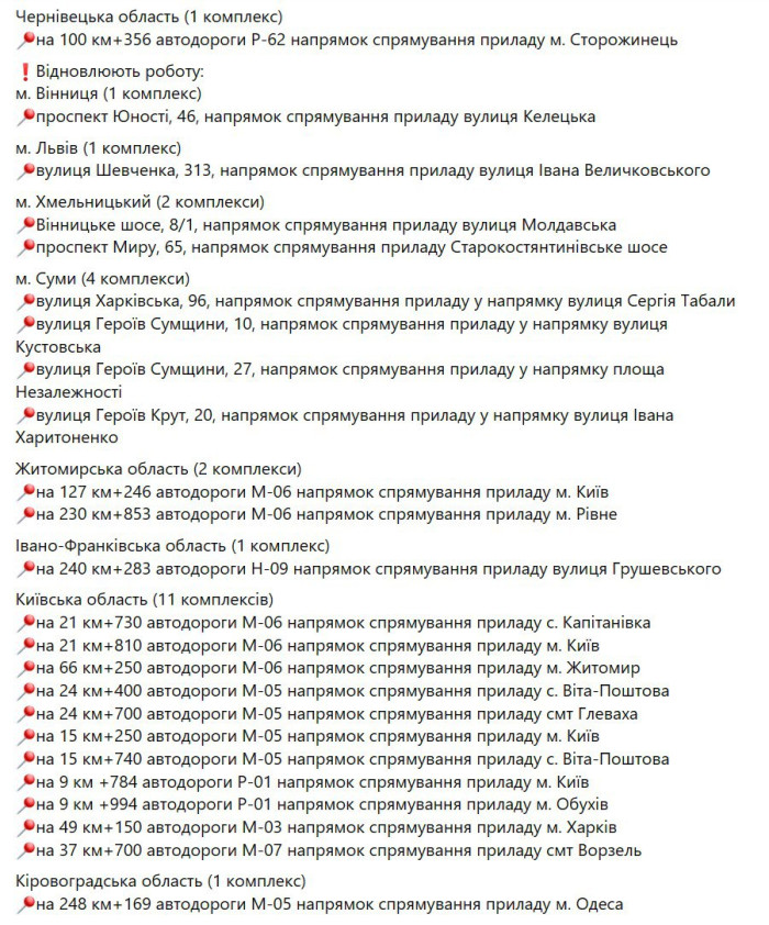 Зазначається, що 31 відеокамера була відключена з початку війни, ще 19 буде запущено вперше. Повний список локацій, де камери заробили доступний нижче.