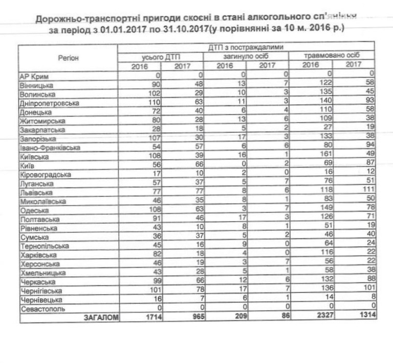 Цього року найбільше «п’яних ДТП» зафіксовано в Чернігівській, Львівській, Черкаській області та в Києві. У свою чергу, найменше подібних аварій сталося на дорогах Чернівецької, Рівненської, Кіровоградської та Тернопільської областей.