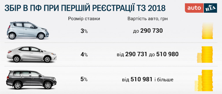 Ставка збору до Пенсійного фонду залежить від вартості автомобіля: її розмір може бути 3, 4 або 5%. Щоб дізнатися розмір «своєї» ставки, в таблиці знайдіть діапазон, в який потрапляє куплений (або проданий від юридичної особи) вами автомобіль. Рамки цих діапазонів визначаються розміром прожиткового мінімуму (РПМ) для працездатних громадян, встановленим на 1 січня відповідного року. Тобто, ці значення залишаться дійсними до 1.01.2019, навіть якщо РПМ буде змінено посеред року.