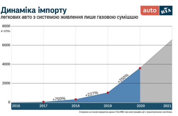 Перші два місяці 2021 року б’ють рекорди, в країну завезли 1129 газових авто, це по 560 в місяць, тоді як в минулому році місячний показник становив 360 одиниць.