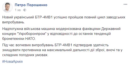 Президент України Петро Порошенко повідомив про завершення заводських випробувань нової бойової машини – БТР-4МВ1. Про це глава держави на писав у Facebook.