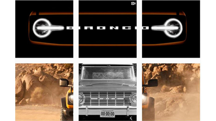 На цей раз тизер складається з шести фотознімків, розміщених в Instagram, які разом складають більш-менш єдине ціле. Зв’язок із дизайном оригінального Bronco абсолютно очевидний: як і його предок, новий позашляховик отримує круглі фари, правда, вже зі світлодіодами. Дві світлодіодні смуги на передній панелі, які «прорізають» світлодіодні кільця, є покажчиками поворотів, за аналогією з Bronco, представленим в 1964 році.