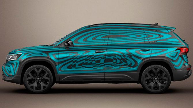 Німецький бренд Volkswagen демонструє три фотографії, на яких Taos обклеєний плівкою з добре відомим «психоделічним принтом», який німецький автовиробник часто використовує для своїх новинок перед фактичної презентацією.
