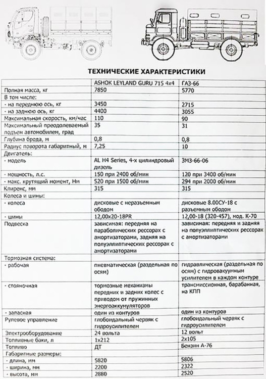 На відміну від ГАЗ-66 у Ashok Leyland Guru 715 пневматична гальмівна система і 24-вольтне електрообладнання, більший запас ходу, але при цьому, така ж проста конструкція і на ресорах.