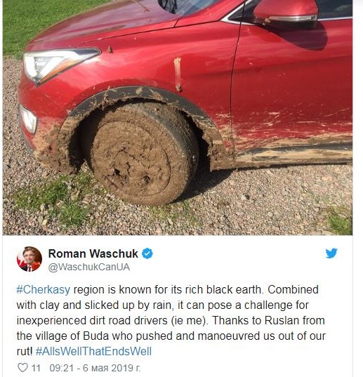 «Черкаська область знана своїми родючими чорноземами. У поєднанні з глиною і дощем, це може стати викликом для недосвідчених водіїв (таких, як я). Дякую Руслану з села Буда, який підштовхнув нас і допоміг виїхати з колії», – повідомив дипломат.