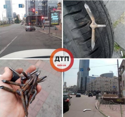 Так, буквально сьогодні вранці (4 вересня) у Києві на вул. Басейній автомобіліст прокол колесо явно не зі своєї вини – невідомий розсипав на дорозі такі ось «їжачки», зроблені із цвяхів: