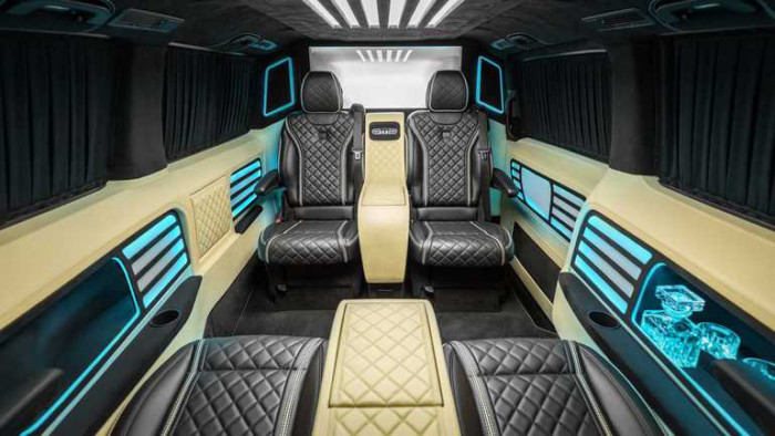 Взявши V-Class, який вже з заводу є вельми розкішним мінівеном, Schawe перетворив його в щось, у чому ви хотіли б жити. Шкіра на приладовій панелі і на панелях — це Nappa, що складається з чорної шкіри Mercedes-Benz і вишукана шкіра Bentley яскравого відтінку магнолії. Перфорована шкіра на сидіннях з підігрівом прикрашена ромбоподібними візерунками, з обробкою з алькантари і іншої шкіри, що замінює попередні пластикові планки.
