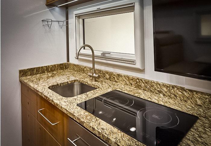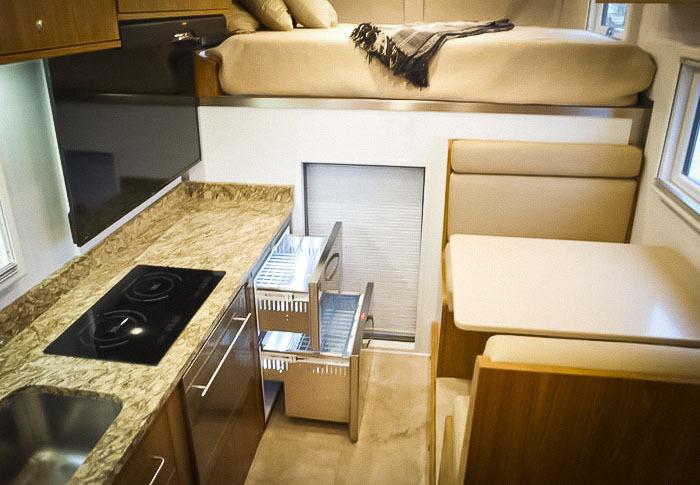 Найцікавіше у UXV-MAX RV знаходиться позаду дворядної кабіни. Житловий модуль зі скловолокна має просту і логічну компоновку. По одному борту вишикувалося кухонне обладнання (плита, раковина, пральна і посудомийна машина).