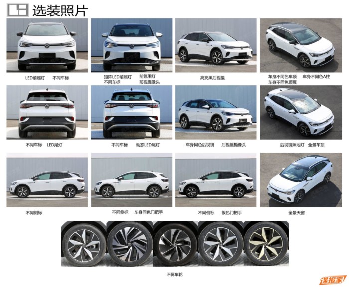 Між собою ID.4 Crozz і ID.4X розрізняються оформленням бамперів, задніх ліхтарів і світловідбивачів, дизайном колісних дисків, пластиковими накладками в нижній частині кузова, а також дзеркалами. Опубліковані й габарити: довжина, ширина і висота у ID.4 Crozz складають 4592, 1852 і 1629 мм проти 4612, 1852 і 1640 мм — у ID.4X. Кросовери будуть комплектувати колесами R19 і R20 (в залежності від комплектації). Обидві моделі можуть похвалитися світлодіодними фарами, панорамними дахами і камерами кругового огляду.