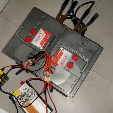 Плюс і мінус на одному кінці акумулятора підключити між собою, тобто плюс одного АКБ до мінусу другого. (див. фото) На вихід в першу чергу інвертор, в другу чергу зарядне. Коли в розетці немає живлення – або ЗП, або інвертор, або спеціальний тестер показуватиме вольтаж і температуру, яка в даний момент на клемах. Кнопкою включити інвертор і під’єднати переноску. Ось і все, ви забезпечені світлом.