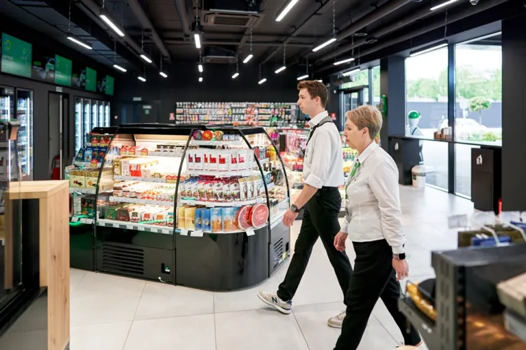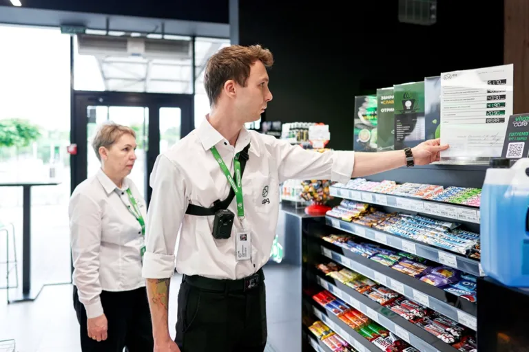 Отже разом з інспектором в виданні переконалися, що на просторій і бездоганно чистій території все гаразд, тож підходимо до приміщення АЗК. Вхід помітний здалеку: двері широкі, перед ними вільний простір, щоб відвідувачі могли безперешкодно розминутися. Обабіч стоять стелажі з актуальними сезонними товарами. Поки перевіряльник позначає у своїй анкеті, що їхні таблички та цінники чисті, не вицвіли на сонці та не вкриті пилом, ми заходимо до великого, наповненого світлом приміщення – чистого та комфортного.