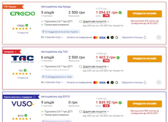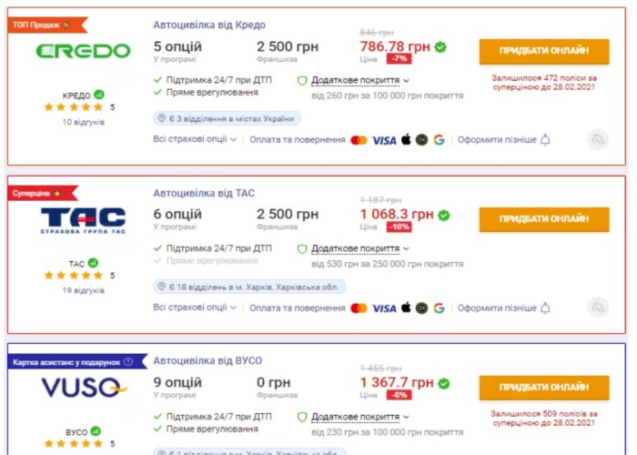 У цій справі допомогу слід шукати на трастових агрегаторах. Так, наприклад, всеукраїнський сервіс hotline.finance зібрав у каталозі понад 80 пропозицій від українських СК. Вибір і оформлення відбувається в режимі онлайн, а готова страховка надсилається клієнту на e-mail в форматі PDF.