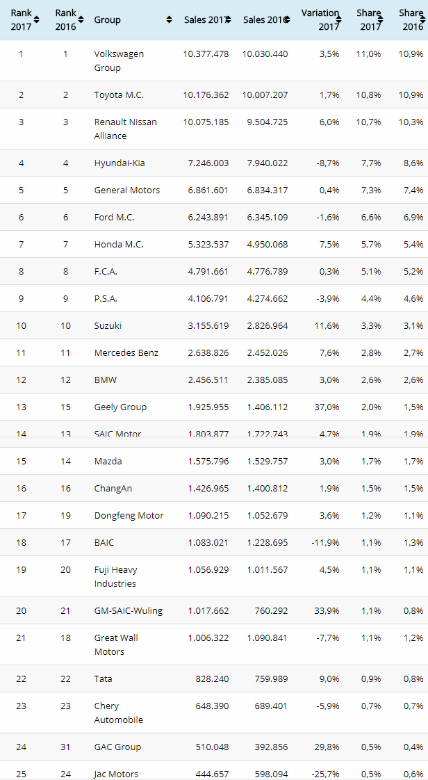 Всего в мировом рейтинге автопроизводителей по результатам 2017 по сравнению с позапрошлым годом не произошло изменений вплоть до 12-того места. А вот на 13-е вышел китайский концерн Geely Group, который не только владеет легковым подразделением Volvo, но и недавно стал акционером Daimler AG. За ним выстроились другие китайские автомобильные компании, которые продали более миллиона автомобилей каждый.
