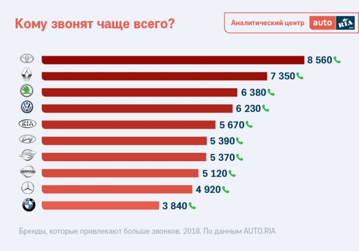 Чаще всего покупатели звонят в салоны Toyota — 8 500 открытий номеров телефона получили предложения о продаже именно этой марки авто. На втором месте Renault (7,3 тыс.), А замыкает тройку лидеров Skoda — 6,3 тысячи открытий. Конверсия открытий номеров в звонки в салоны на AUTO.RIA в среднем составляет 63%.