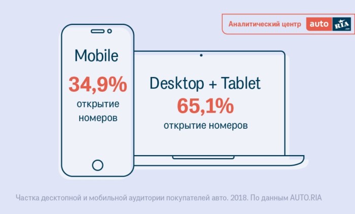 Чаще ищут авто и просматривают телефоны салонов с десктопа, хотя сегмент мобильной аудитории постоянно растет и уже сравнялся с ПК во всем, кроме открытий номеров.